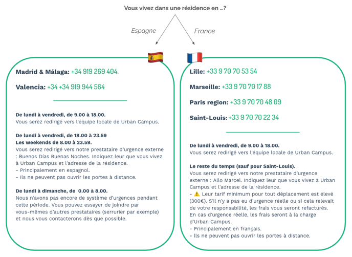 - Attention ! Si vous utilisez un numéro d'urgence en dehors des heures de travail, et qu'il n'y a pas de réelle urgence, les frais seront à votre charge. En cas d'urgence réelle, les frais seront à la charge d'Urban Campus. Veillons ensemble à ce que la ligne reste ouverte pour ceux qui ont vraiment besoin d'une aide urgente et immédiate.